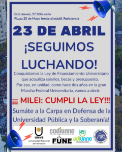Por eso, en unidad, como hace dos años en la gran Marcha Federal Universitaria, vamos a decir ¡¡¡ MILEI: CUMPLI LA LEY!!!