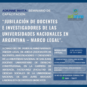 Por cuestiones de atención a familiar informado por el Dr. Alamino, se suspende el «Seminario de capacitación sobre Jubilación de docentes e investigadores de las Universidades Nacionales en Argentina-Marco Legal». Se reprograma la fecha para el lunes 4 de agosto en el mismo horario. Pedimos disculpas y esperamos contar con su presencia en la fecha reprogramada. Saludos cordiales. CD ADIUNNE