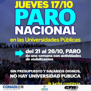 El Plenario de Secretarías Generales de CONADU Histórica -que sesionó este martes 15 de octubre- resolvió profundizar el plan de acción gremial en defensa de la Universidad Pública, por la recomposición salarial y el presupuesto universitario. En tal sentido, se definió convocar a un paro nacional para este jueves 17 de octubre sin asistencia a los lugares de trabajo; y paro de una semana del 21 al 26 de octubre con actividades de visibilización.