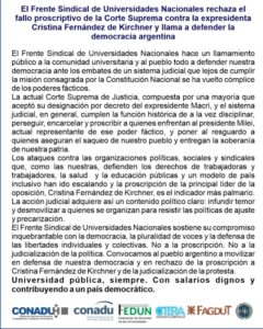 El Frente Sindical de Universidades Nacionales rechaza el fallo proscripto de la corte suprema contra la expresidenta Cristina Fernandez de Kirchner y llama a defender la democracia argentina