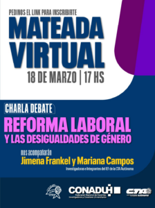 Vamos a compartir una charla–debate sobre la reforma laboral y las desigualdades de género. Nos acompañarán las compañeras Jimena Frankel y Mariana Campos, investigadoras del Instituto de Estudios y Formación de la CTA Autónoma.